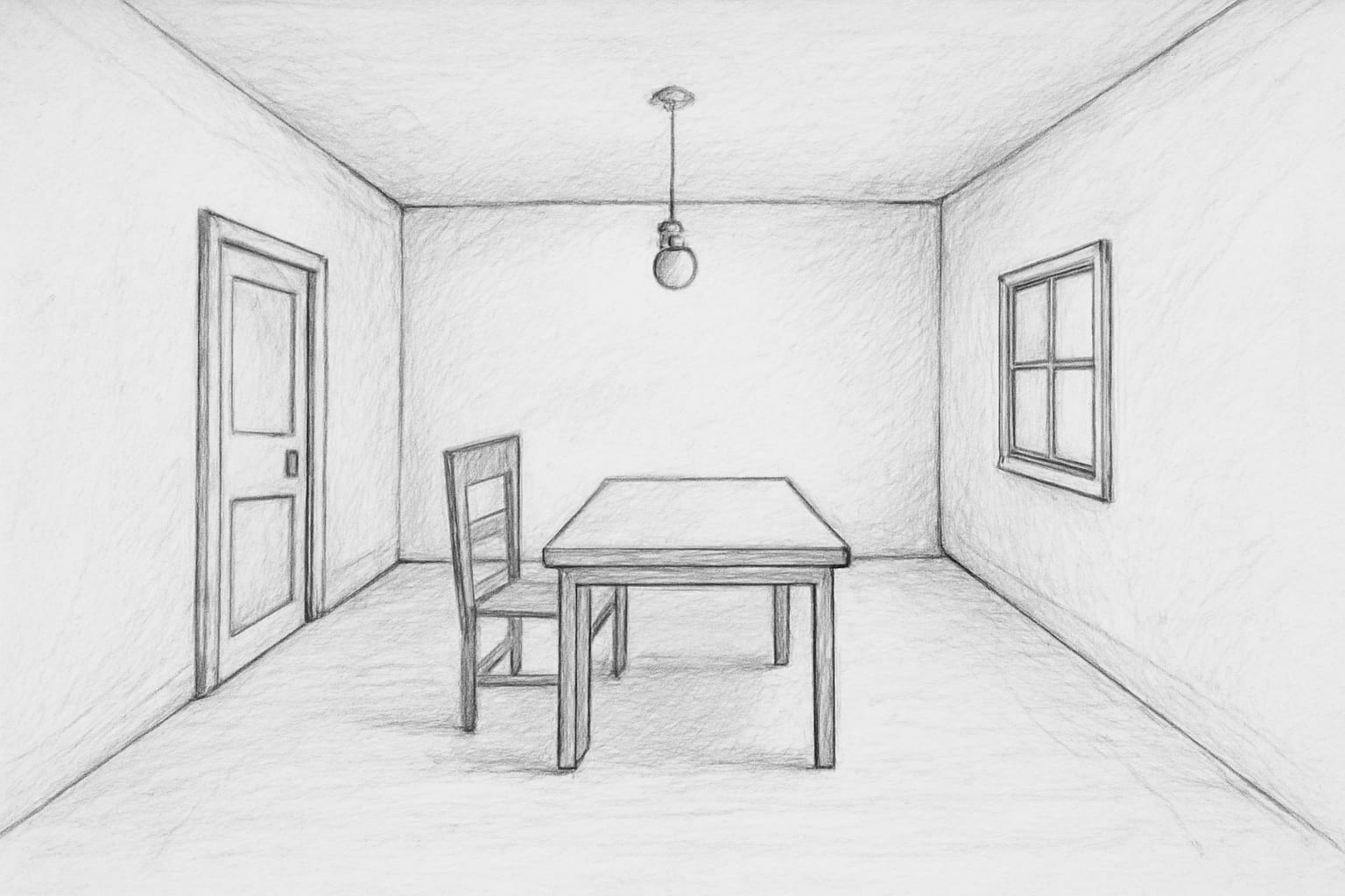 Ques: Sketch a simple room from the point of view of a person sitting at the center. The room has a rectangular shape with a door on one wall and a window on the opposite wall. There is a table in the middle of the room, a chair next to it, and a light bulb hanging from the ceiling.